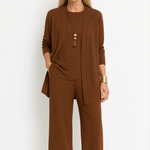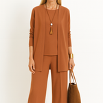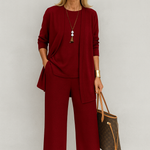 Descubre la sofisticación atemporal con nuestro conjunto Amelia, un conjunto versátil de tres piezas diseñado para un estilo effortless. Elaborado con un tejido lujoso y suave, este outfit incluye un cardigan fluido, una parte superior ajustada y pantalones de pierna ancha, perfectos tanto para entornos profesionales como salidas casuales. Disponible en colores ricos como negro y burdeos profundo, ofrece un ajuste favorecedor y comodidad todo el día.